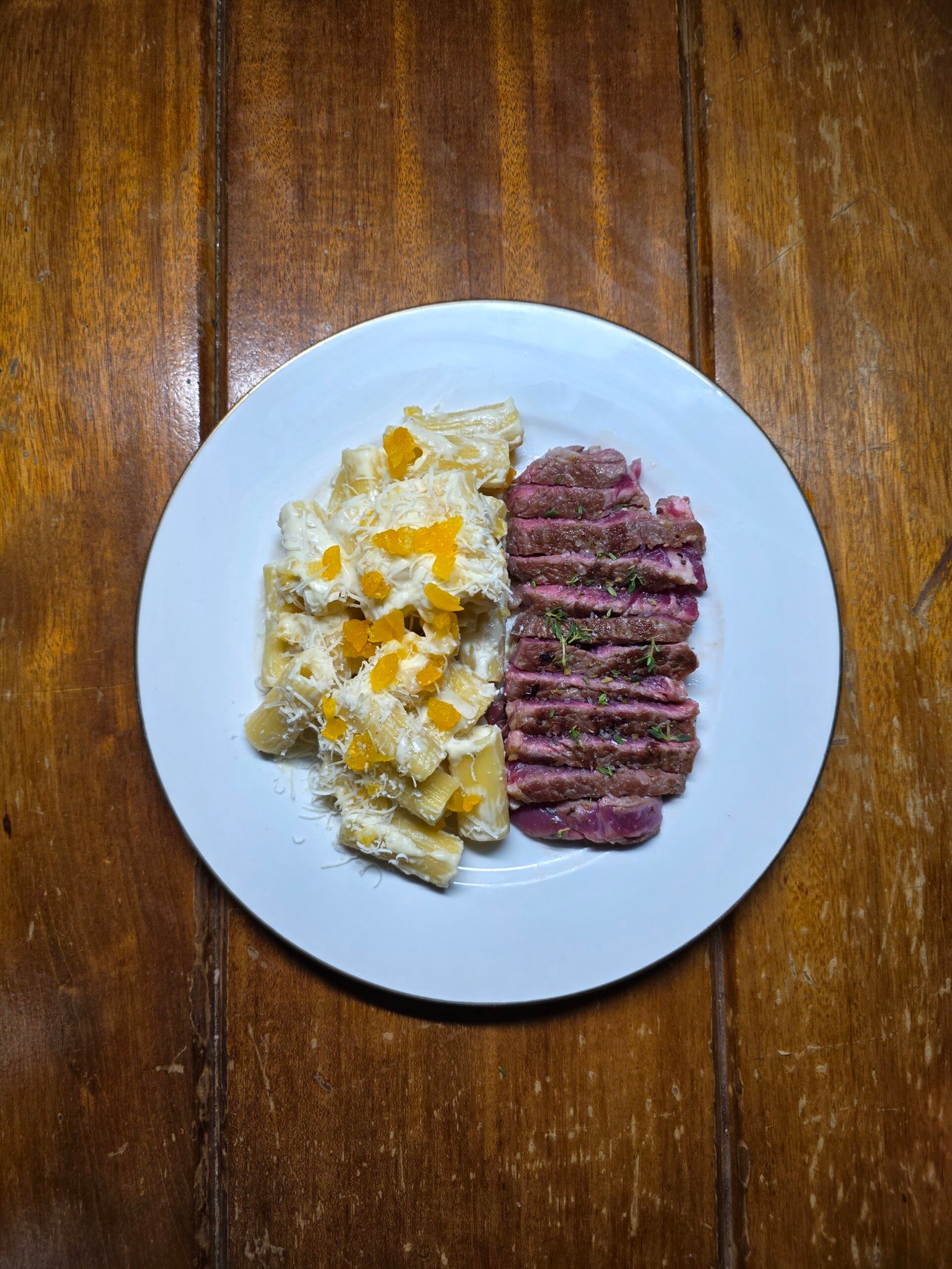 Bife Ancho com Rigatoni ao Molho de Queijo Brie e Damascos (2 pessoas)