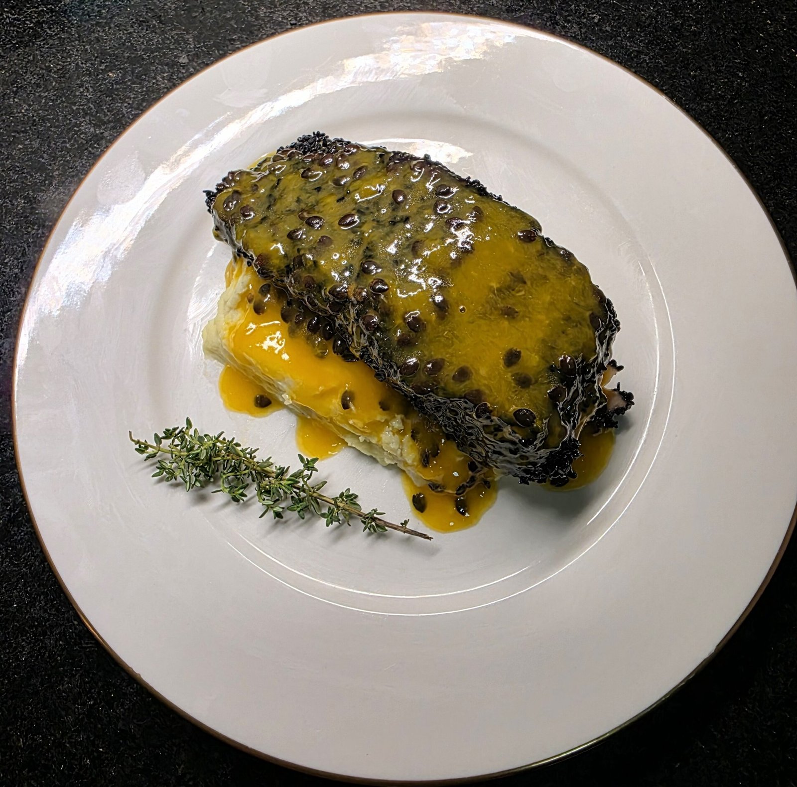 O purê de batata-doce entra trazendo cremosidade e conforto, equilibrando o prato, enquanto o molho de maracujá finaliza com acidez e frescor na medida certa, costurando todos os elementos de forma harmônica. Todos os ingredientes são enviados porcionados e planejados para um preparo simples e prazeroso, convidando você a ser o chef da noite e aproveitar cada etapa com calma e presença.